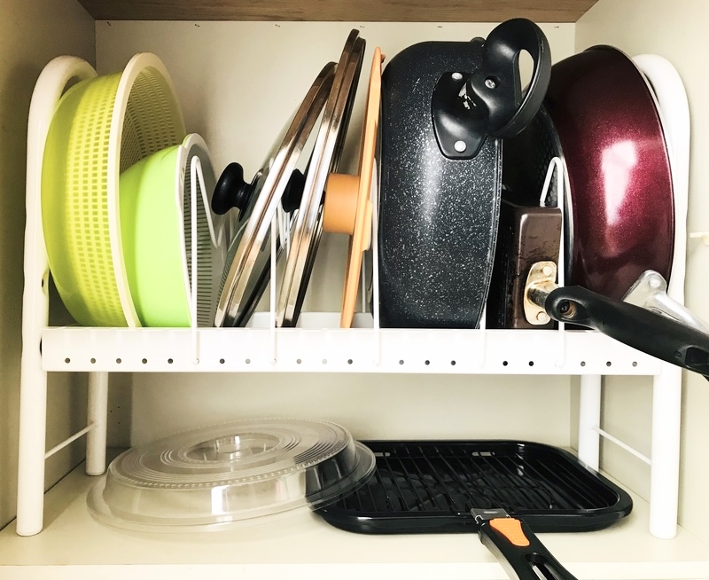 おススメ点は、なんといってもアレンジが自由なところ。フライパンや鍋などの幅によって仕切りワイヤーの位置が調節できるし、棚の高さも調節できるから自分好みに使えます。収納力もアップ!キッチンが使いやすくなって料理も楽しくなってきました。