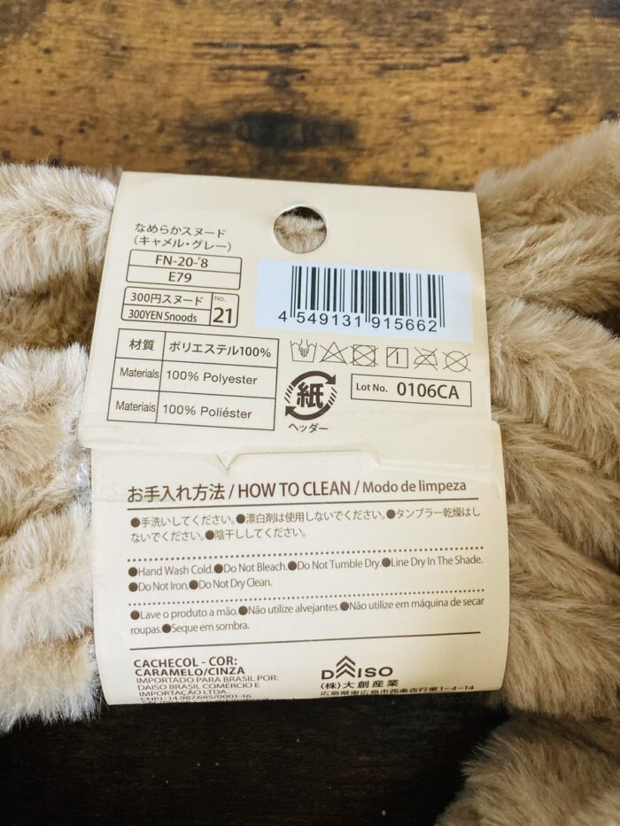 今年はキャラメル系カラーの大きめスヌードが欲しいと思っていたのですが、きっと1,900円くらいはするだろうなと覚悟していました。ところが、なんとダイソーで発見!
