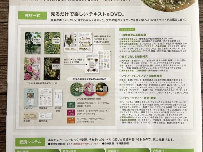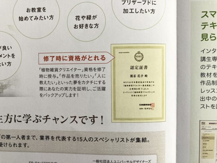 この養成講座を知ったときは「植物雑貨クリエイターに資格ってあるの?」と驚きましたが、修了すると認定証書が授与され、資格取得となるみたいです ↓