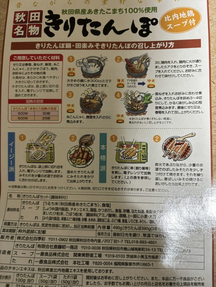 こちらは秋田県の玉川温泉に宿泊した時に購入したお土産品です。きりたんぽ鍋と田楽みそたれ2つの味が簡単に楽しめて、とても美味しかったです。