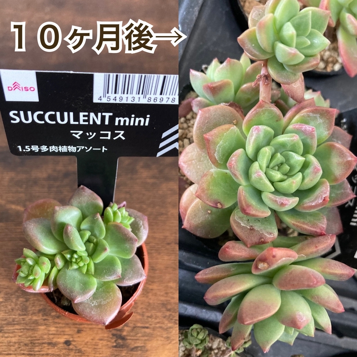 2月の真冬で5℃前後の場所に置いているため断水、休眠中。親株も脇芽の子株も大きく立派に成長しました。紅葉して可愛い!