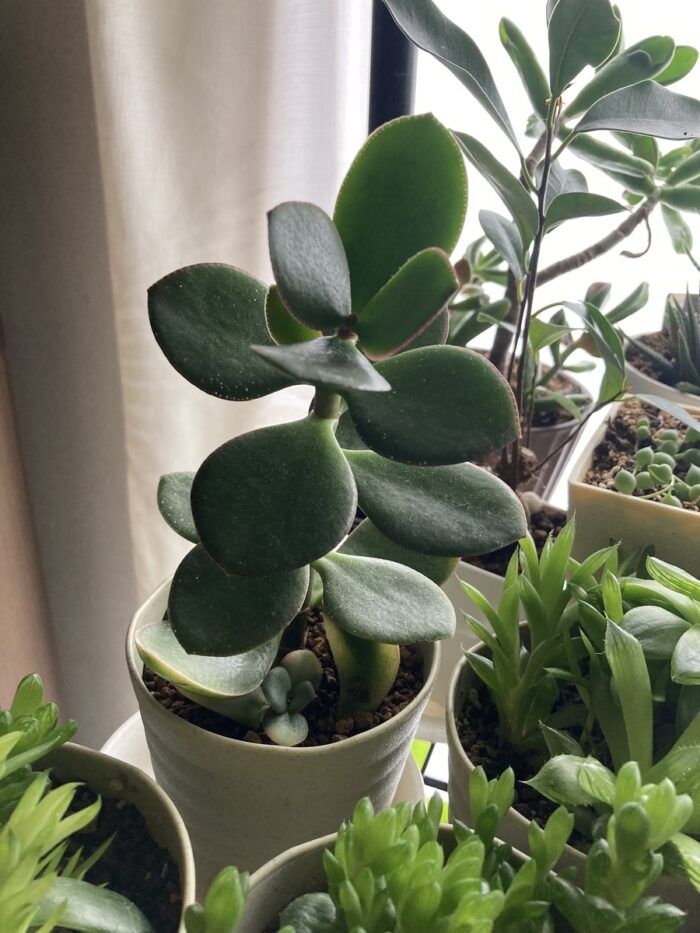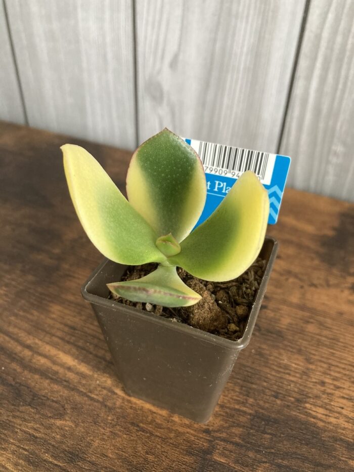 ダイソーで購入した金のなる木。クラッスラ属としか記載されてなかったんですが、品種は花月錦?黄金花月?それ以外?ちょっと見分けがつきません(汗)