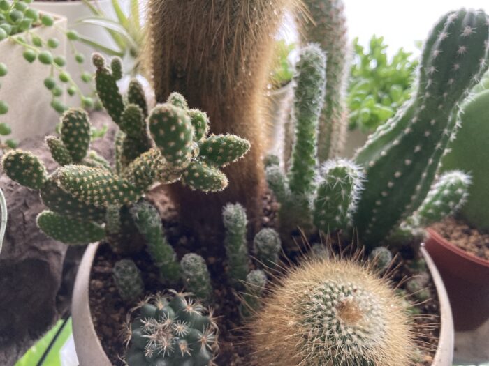 ちょっとわかりづらいですね(汗)手前の2種類のサボテンの後ろに並んでいるのが銀手毬の子株で、その後ろの真ん中あたりに親株があるんですが・・・。去年、子株を取って植えたんですが、伸びて徒長してますね。