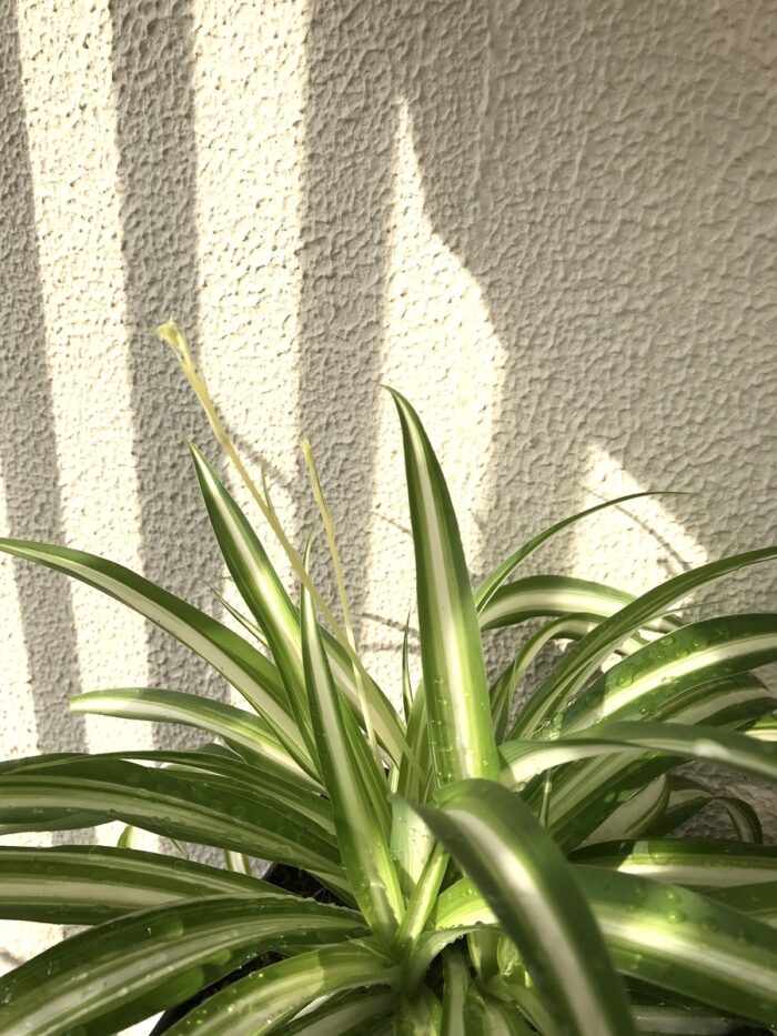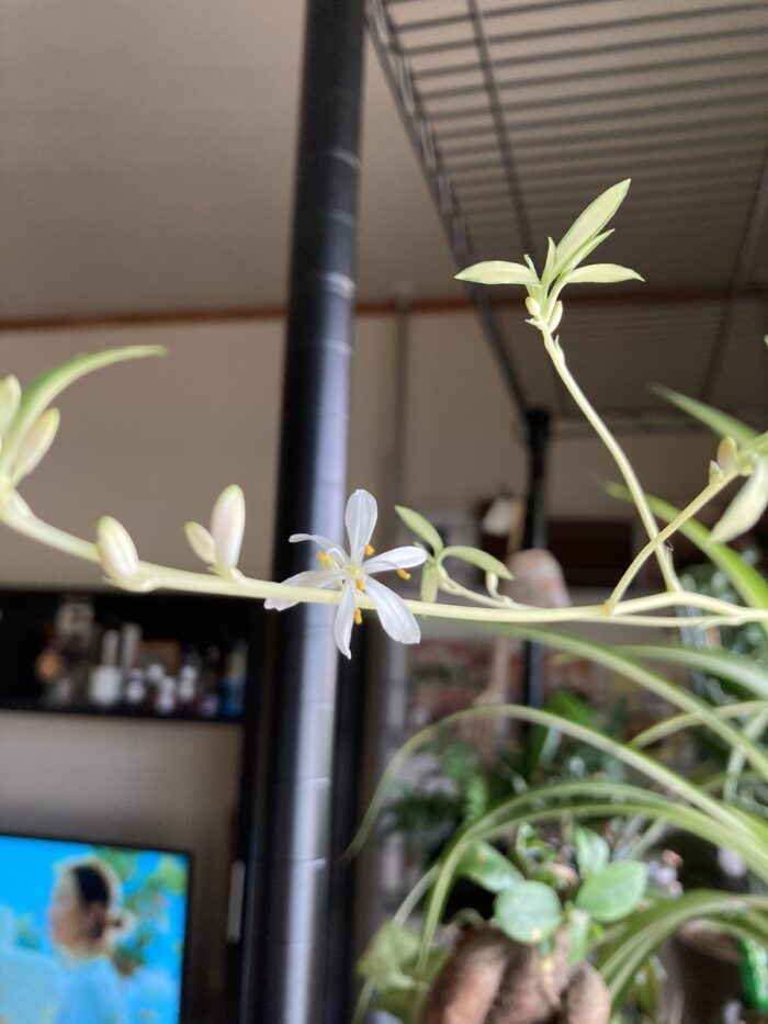 お花がばっちり咲いてました!あまり開花してるところに遭遇しないので不思議に思ってたのですが、オリヅルランの花は朝に咲いて夜にはしぼんでしまう一日花なんだそうです。