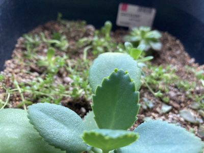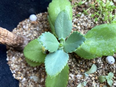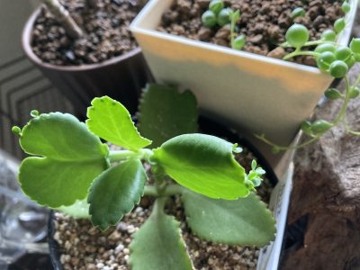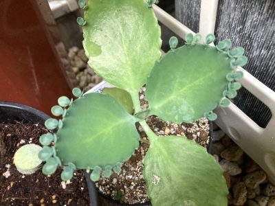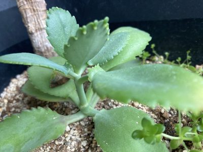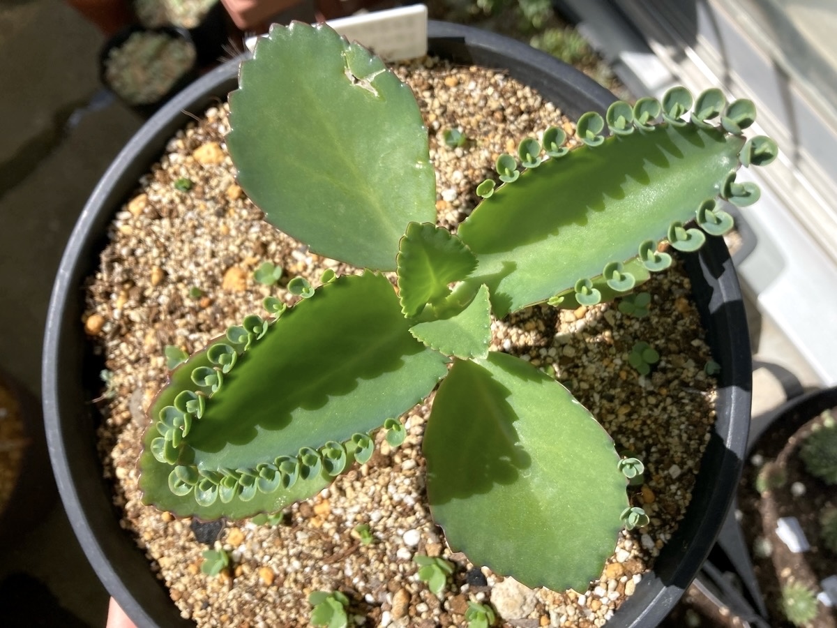繁殖力に惹かれて購入。葉のフチ全体に子株をびっしりつける姿がフリルのようで可愛いんですよね。「胡蝶の舞」と「子宝弁慶(シコロ弁慶)」の交配種で、花言葉はイメージ通りの「子孫繁栄」