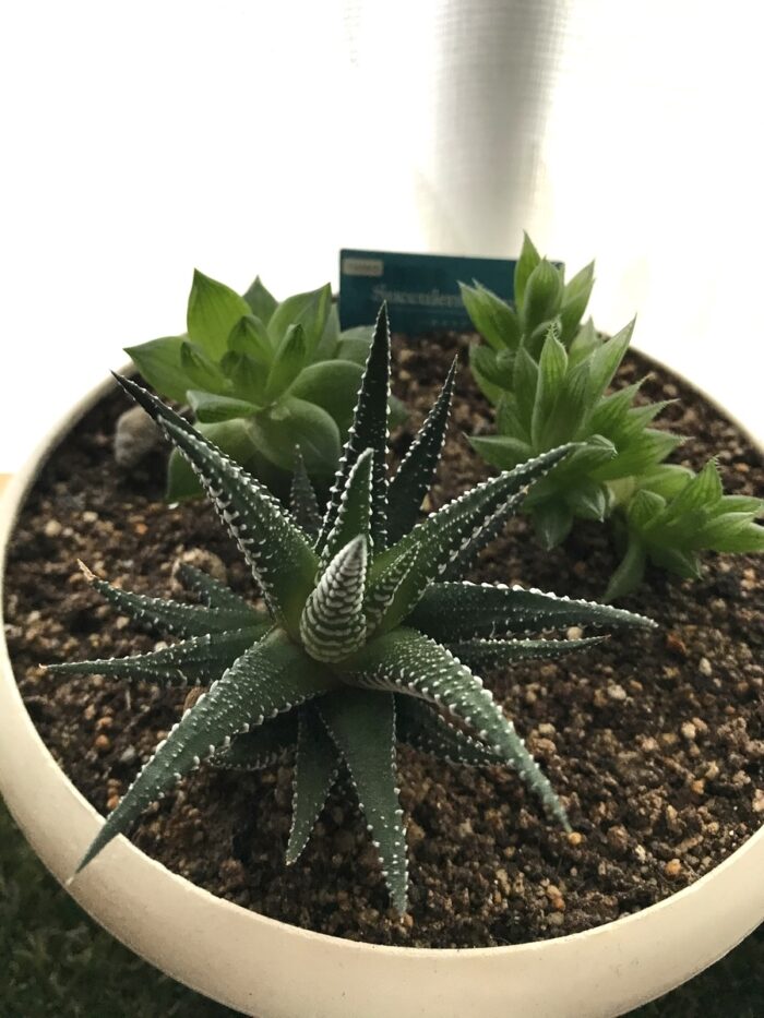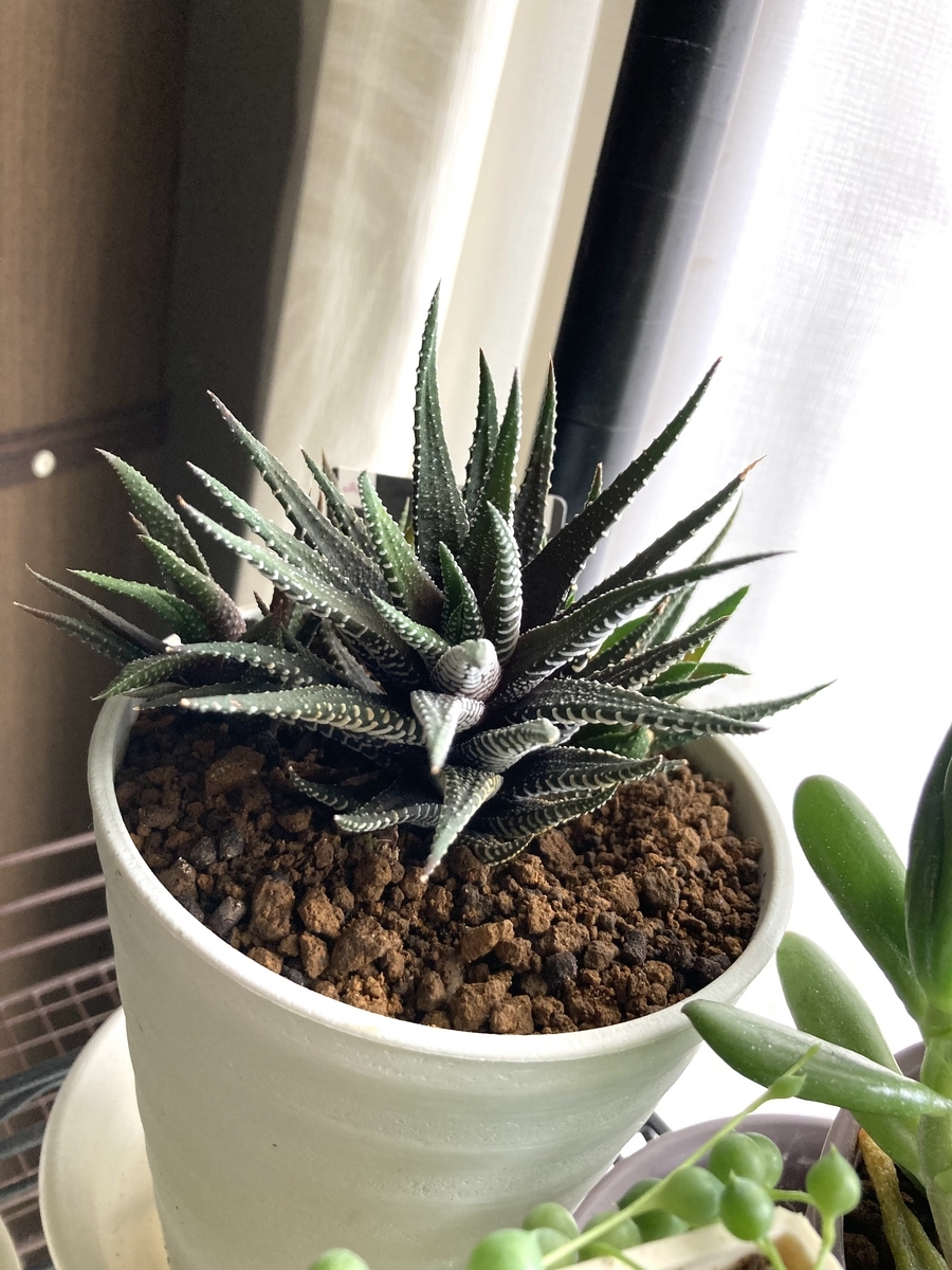10年以上前に植物園で購入した硬葉系ハオルチア。ゼブラ柄なので十二の巻かと思われます。※後ろ脇に見えるのはダイソー産で別種類です。