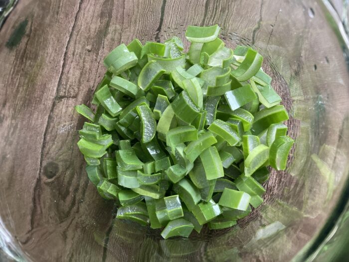 2.ピーラーなどでアロエのトゲを取り、皮ごと約5mm幅の短冊切りにする